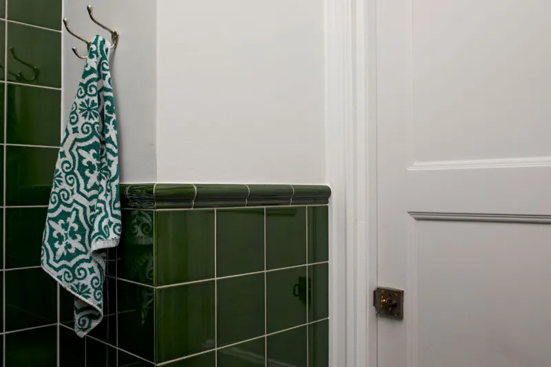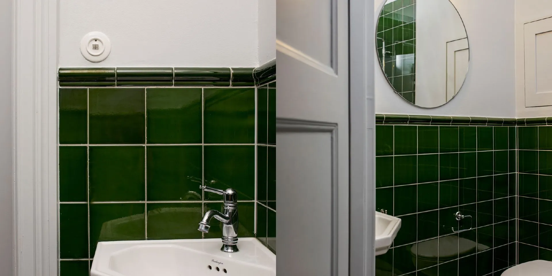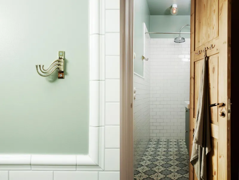 Badrum med väggar i Alcros Fjäder, dörr i Silverpil i snygg kontrast med grönt kakel. Foto: Klas Sjöberg