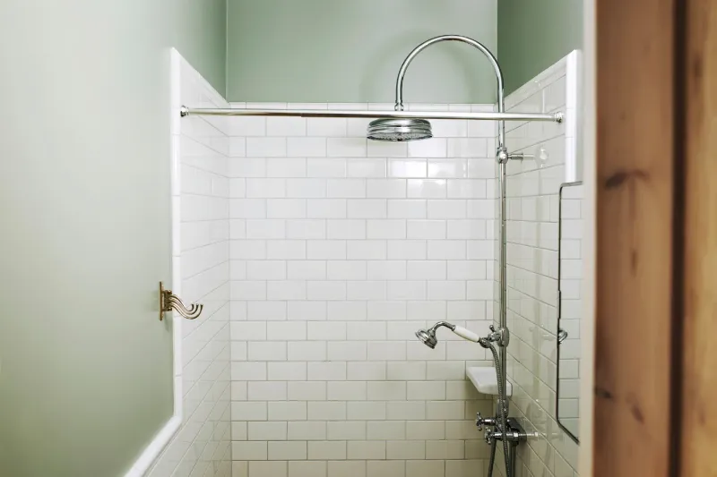 Det här badrummet är målat med Alcro Tät Våtrumssystem i kulören Isglass. Tack vare det varma glödljuset i badrummet framträder de gröna tonerna mer. Foto: Klas Sjöberg