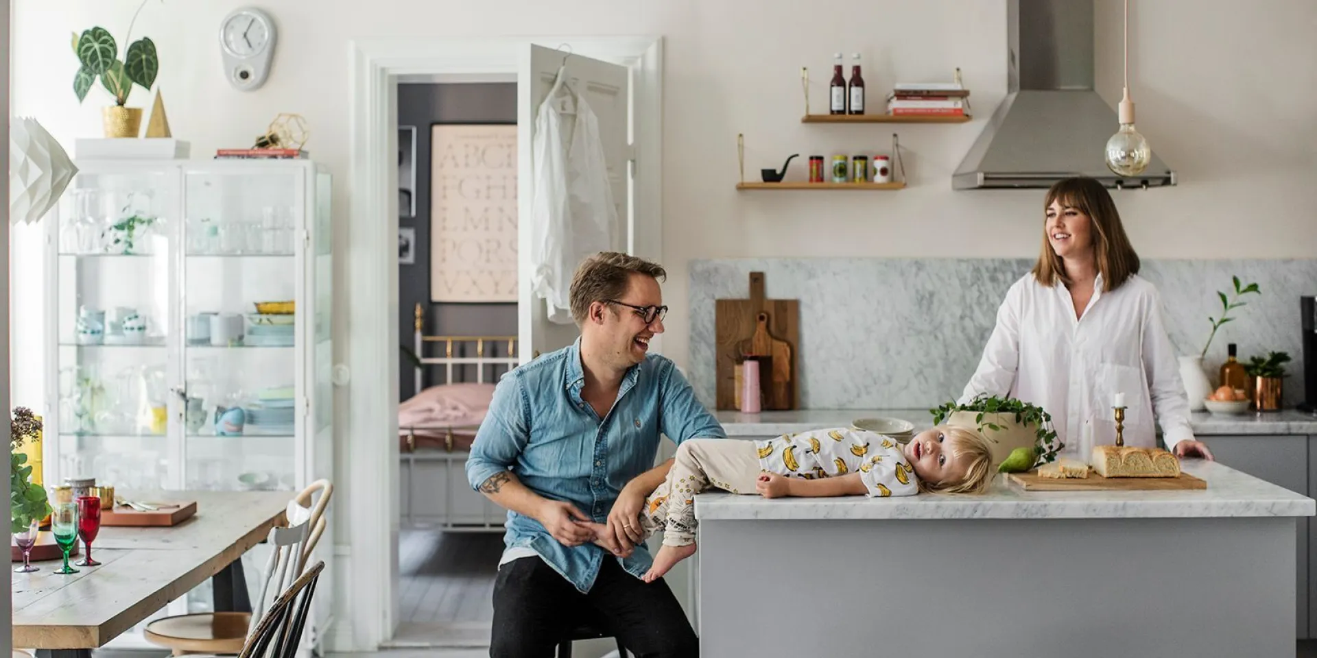 Björn, Alex och Sickan gillar att hänga i sitt öppna kök, målat i Alcros Rosé. Kulören är en fin kontrast mot sovrummet bakom, målat i Sotare. Foto: Lina Östling