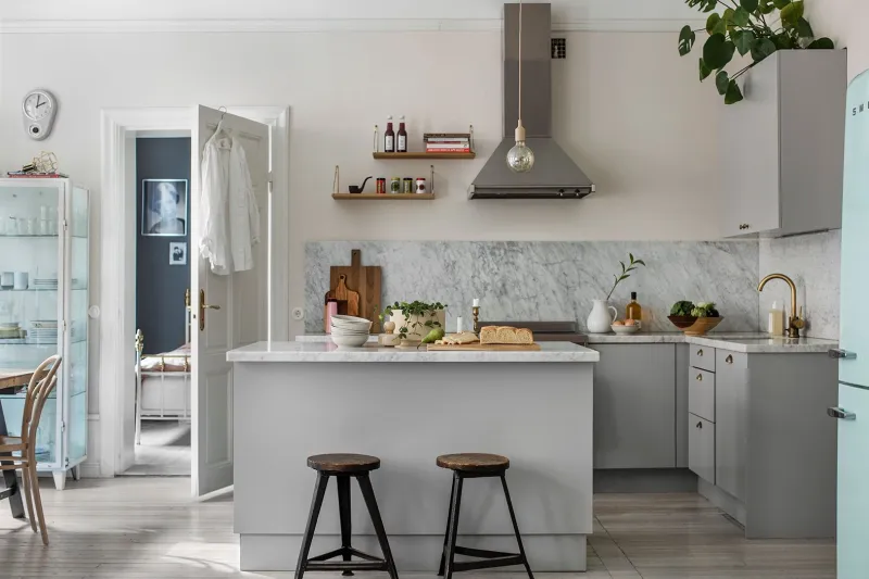 – Vi kom från en liten, men väldigt social lägenhet. Vi kunde ha middagar för 16 personer på den lilla ytan. I nya lägenheten ville vi behålla den känslan och skapa ett skönt utrymme för matlagning och stora middagar.