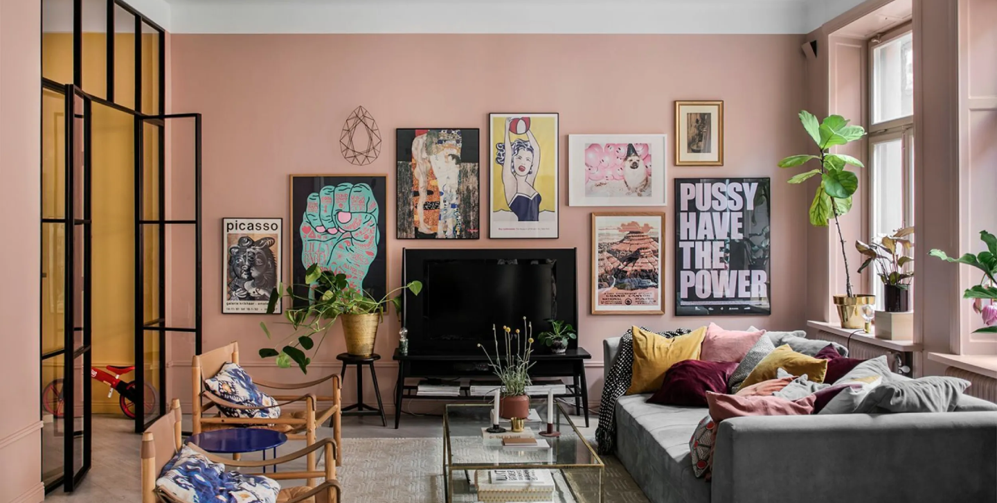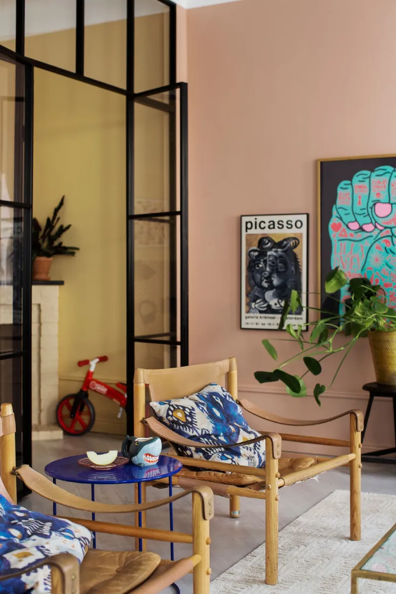 Rosa vardagsrum med Alcros Old Rose. Till vänster skymtar sonens kryp in, i Alcros Mellow Yellow. Foto: Lina Östling