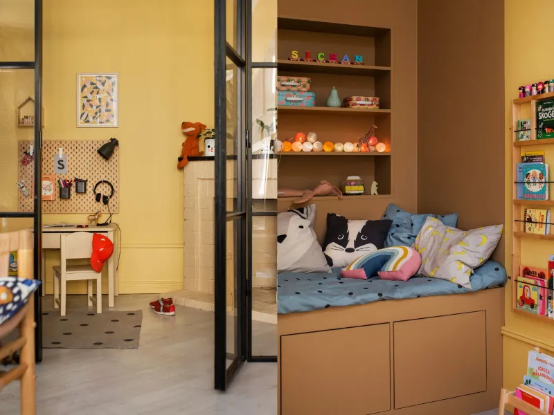 Gula väggar i Sickans rum, med pysselhörna i ljust trä. Till höger hans sovhörna som Björn har byggt. Foto: Lina Östling