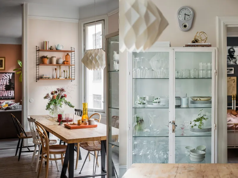 Fint giftermål mellan rummen och de rosa kulörerna. Trevlig idé att låta ett gammalt medicinskåp bli ett vitrinskåp. Foto: Lina Östling