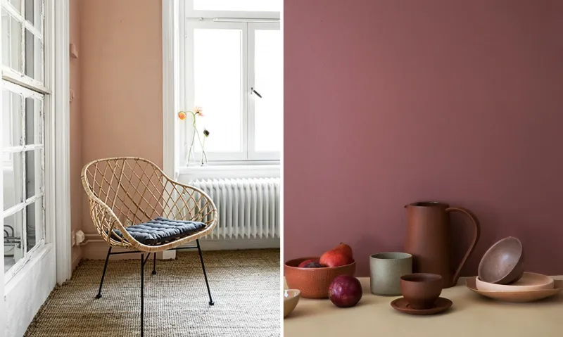 Jag målade sovrummet i mitt förra hem i en dov rosa kulör. Det gav hemmet en harmoni och en värme. Jag verkar aldrig tröttna på den färgskalan, eftersom den går att variera en hel del. Nu till sommaren tycker jag att en rosa kulör blir en fin bas på väggen tillsammans med en massa gröna, slingriga växter. Sedan är det fint att fortsätta med möbler och inredning i trä- och naturmaterial.
