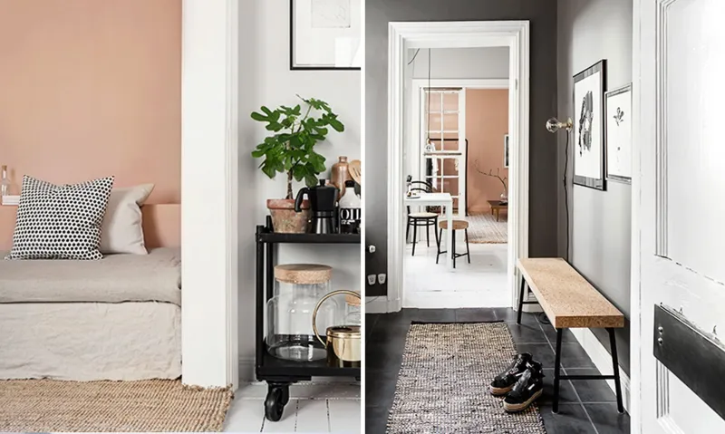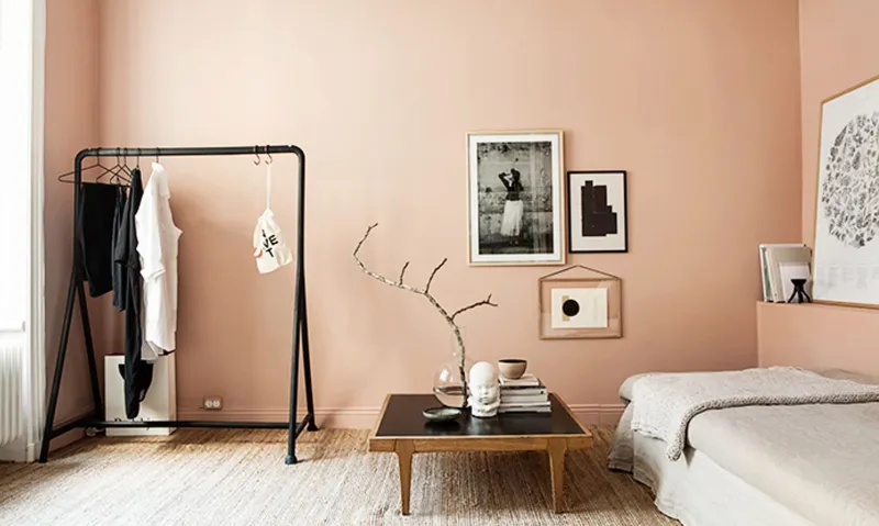 Jag kompletterar gärna med någon detalj i en färg som ger en konstrast mot det rosa, kanske svart eller något i metall. Annars kan det lätt kännas för mjukt och gulligt. Inredningsdetaljer i röda och rostiga toner ger också en snygg effekt. För att skapa en helhetskänsla i rummet är det fint att ta in olika inredningsdetaljer och textil som går ton i ton med väggkulören. Matcha de rosa väggarna med terrakottakrukor, en kudde i kolafärgat sammetstyg eller en grupp med keramikföremål i naturtoner. Ett annat tips är att måla in hyllor i samma nyans som väggen, det förstärker helhetskänslan.