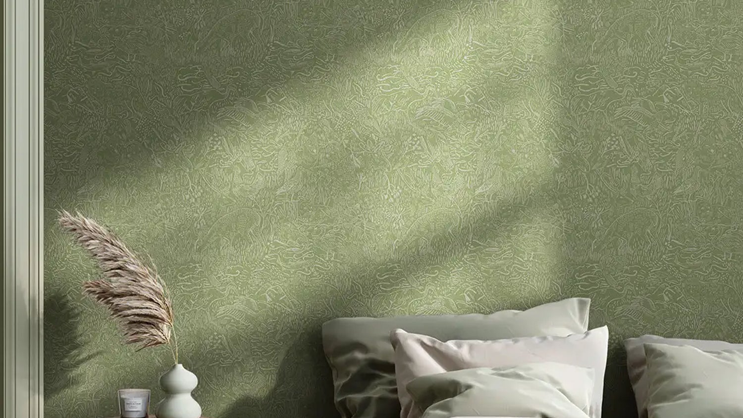 Kom närmare naturen med gröna färger och inspirerande mönster. Tapet: ”26023 Landskapsdjur” från Midbec.