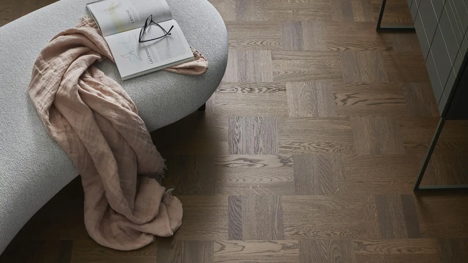 Parkettgolv i ek med ett rutbrädemönster är ett vanligt retro-val.