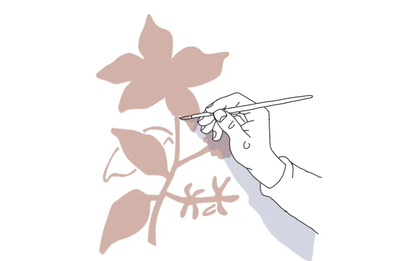 Om det saknas färg i mönstret eller om det kommit utanför kan du måla i det efteråt. Om du låter färgen på väggen torka till klibbfri innan du handmålar är det mindre risk för kladd, och du har möjlighet att vila handen mot väggen för bättre stöd.
