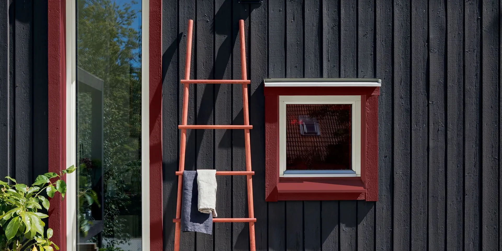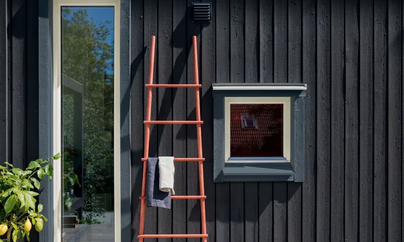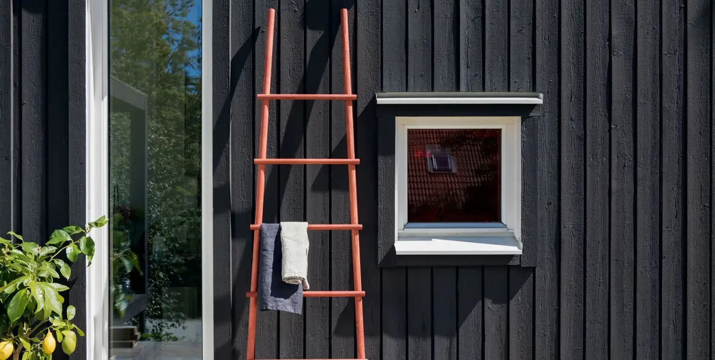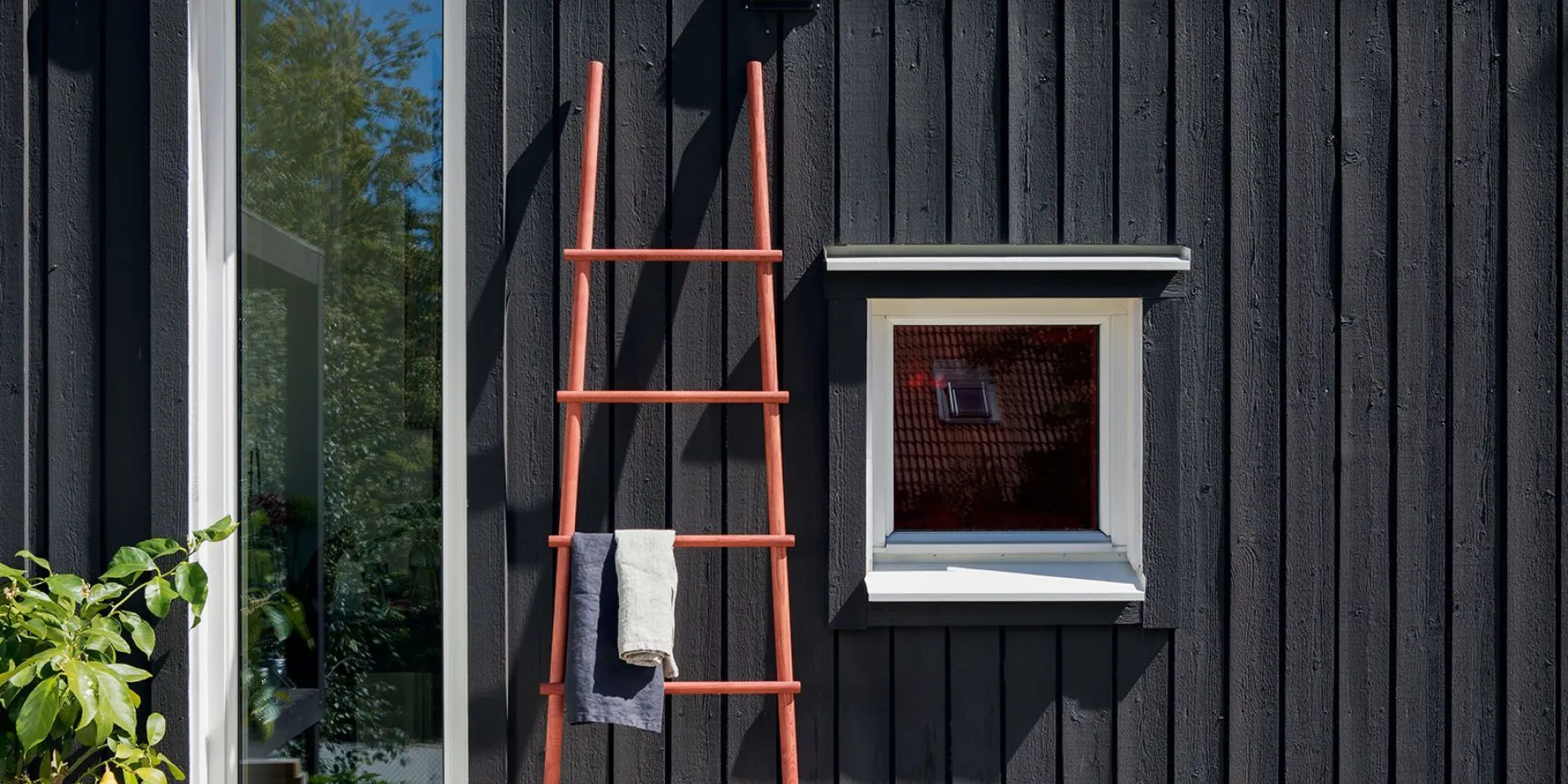 Med vita fönster mot en svart fasad framhävs fönstrens form och placering på fasaden. Stege och handdukar från Tambur.