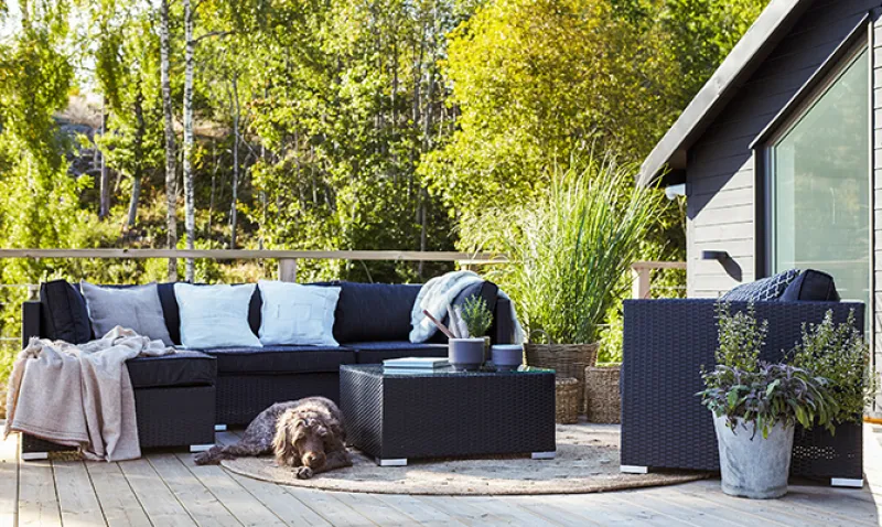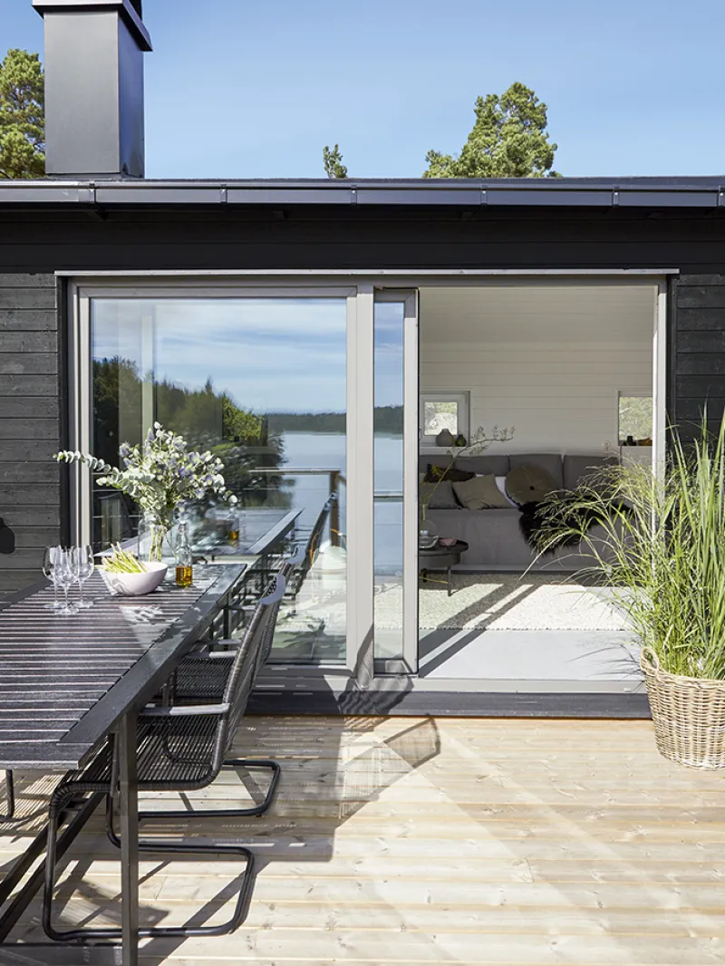 Stora glaspartier i den matt svarta fasaden gör terrassen till en förlängning av vardagsrummet.
