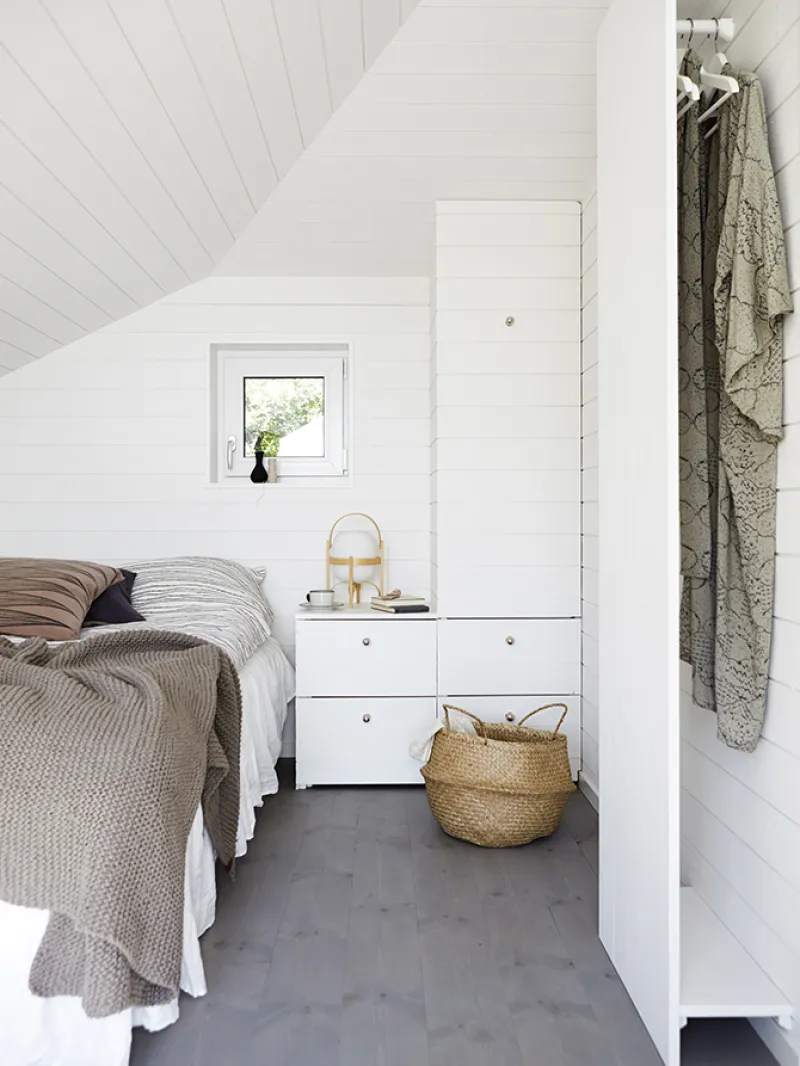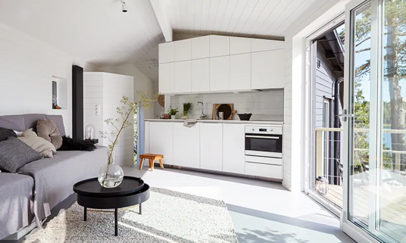 Det ljusa skärgårdshusets interiör går i vitt.