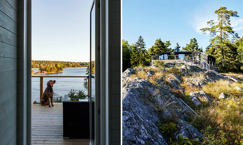 Eftermiddagssolens strålar letar sig fram och värmer den svarta fasaden. Den på sommaren så intensivt trafikerade farleden nedanför ligger ännu blank och stilla. Det är arkitekten Patric Sahlén som ritat det avskalade sommarhuset som kränger och knixar utmed bergets toppar och dalar. Beställaren – ett par med vuxna barn – hade en med tiden växande familj i åtanke när de valde att låta huset på berget komplettera det existerande sommarhuset från 1930-talet.