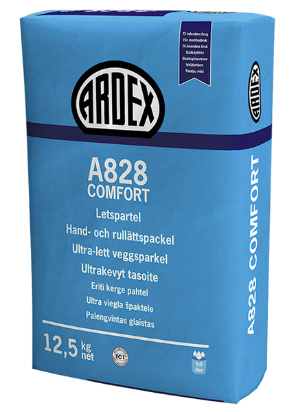 Ultralätt hand- och rullspackel. ARDEX A 828 COMFORT används för spackling, lagning och putsning av vägg och takytor före tapetsering, målning och plattsättning. För fyllning av breda fördjupningar i väggar och tak. För fyllning och lagning av sprickor, håligheter, fogar och spalter.