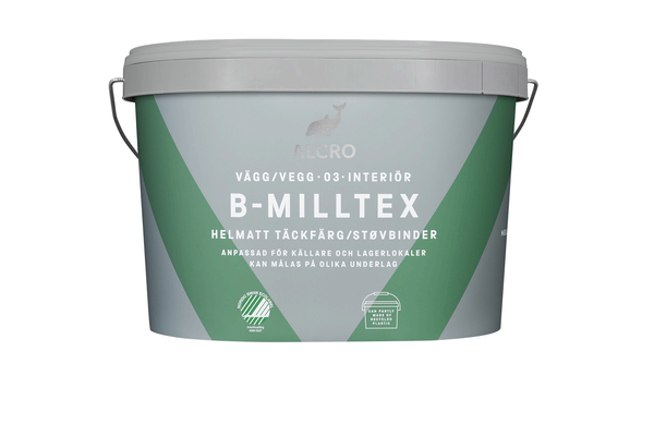 B-Milltex Täckfärg är en täckfärg för målning inomhus på väggar av puts, betong, gipsskivor, träfiberplattor, tapet och väv. Den är främst avsedd för utrymmen som källare och industri- och lagerlokaler där det inte finns några krav på att ytan ska kunna tvättas.
