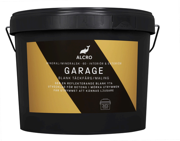 Garage Blank Täckfärg är en blank alkalibeständig akrylatfärg som skyddar underliggande betong mot fukt och karbonatisering. Garage lämpar sig speciellt för skydd av betongkonstruktioner som är utsatta för klimatpåfrestningar och är fri från skadlig sprickbildning som kan inverka på hållbarheten (större än hårfina sprickor). Användningsområden: För målning av betongytor i mörka utrymmen, t.ex park