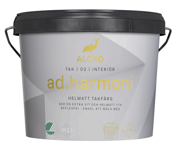 ad.harmoni är en färg av högsta kvalitet för de flesta takytor vid både ny- och ommålning. Färgens unika formulering ger en reflexfri yta och gör färgen lättarbetad utan att droppa och stänka. Färgens extremt låga glans hjälper även till att dölja mindre ojämnheter för ett perfekt slutresultat.