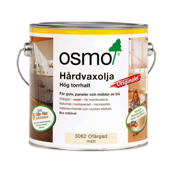 Osmo Hårdvaxolja Originalet 3062 är perfekt för trägolv och ger en vacker yta som bevarar träets naturliga karaktär. Ytan blir vatten- och smutsavvisande, mycket slitstark och tålig mot spill. Idealisk för golv av massivt trä, lamellparkett, OSB eller kork men passar även för möbler, paneler och limträ m.m.Applicering: Trasa, Maskin, Pensel, Penselborste, Roller. Antal appliceringar: 2 vid obehandlad yta. 1 vid slutbehandling av yta infärgad med Osmos produkter eller vid renovering. Torktid: 8-12 h i normala klimatförhållanden, 20 °C och relativ fuktighet, RF 50%. Räcker till: 24 m²/liter vid 1 applicering