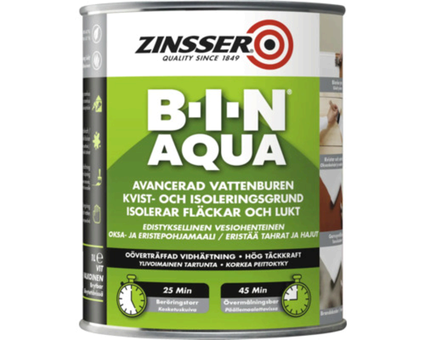 B-I-N® AQUA är en banbrytande avancerad, högpresterande, vitpigmenterad kvist- och isoleringsgrund. B-I-N® AQUA kombinerar en snabb torktid med en oöverträffad vidhäftning och bästa möjliga täckkraft. B-I-N® AQUA grundar, förseglar, täcker fläckar och låser in problemlukt effektivt. Den överlägsna fläckförseglingen gör att produkten även kan användas för försegling av kvistar. B-I-N® AQUA har mycket svag lukt och innehåller endast spår av VOC