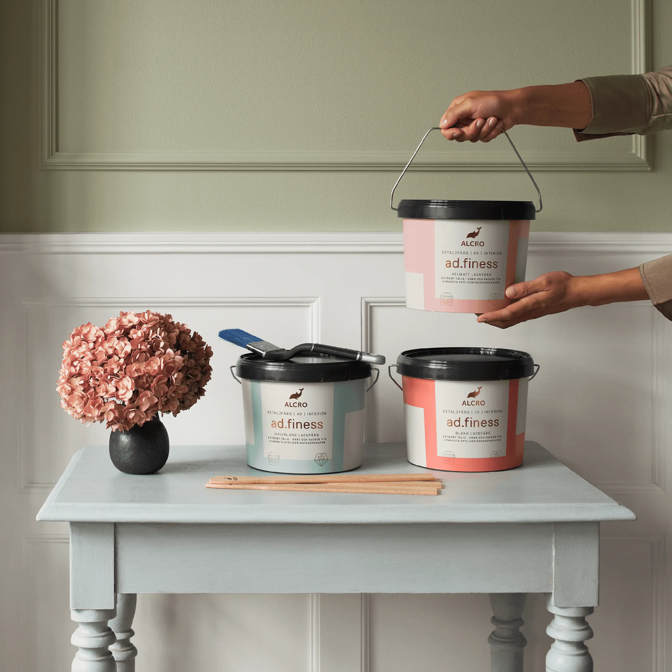 Våra snickeri- och lackfärger ger en jämn och hållbar yta som skyddar och förskönar dina möbler, lister och andra snickerier.